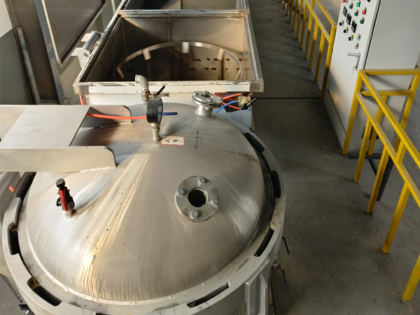 ●浸滲完畢,打開浸滲罐的蓋子,用吊鉤把浸滲籃吊離浸滲罐,讓浸滲籃及其內裝零件表面粘附液滴干,放入甩干機,將膠液甩干,然后把浸滲籃移至洗滌罐中。